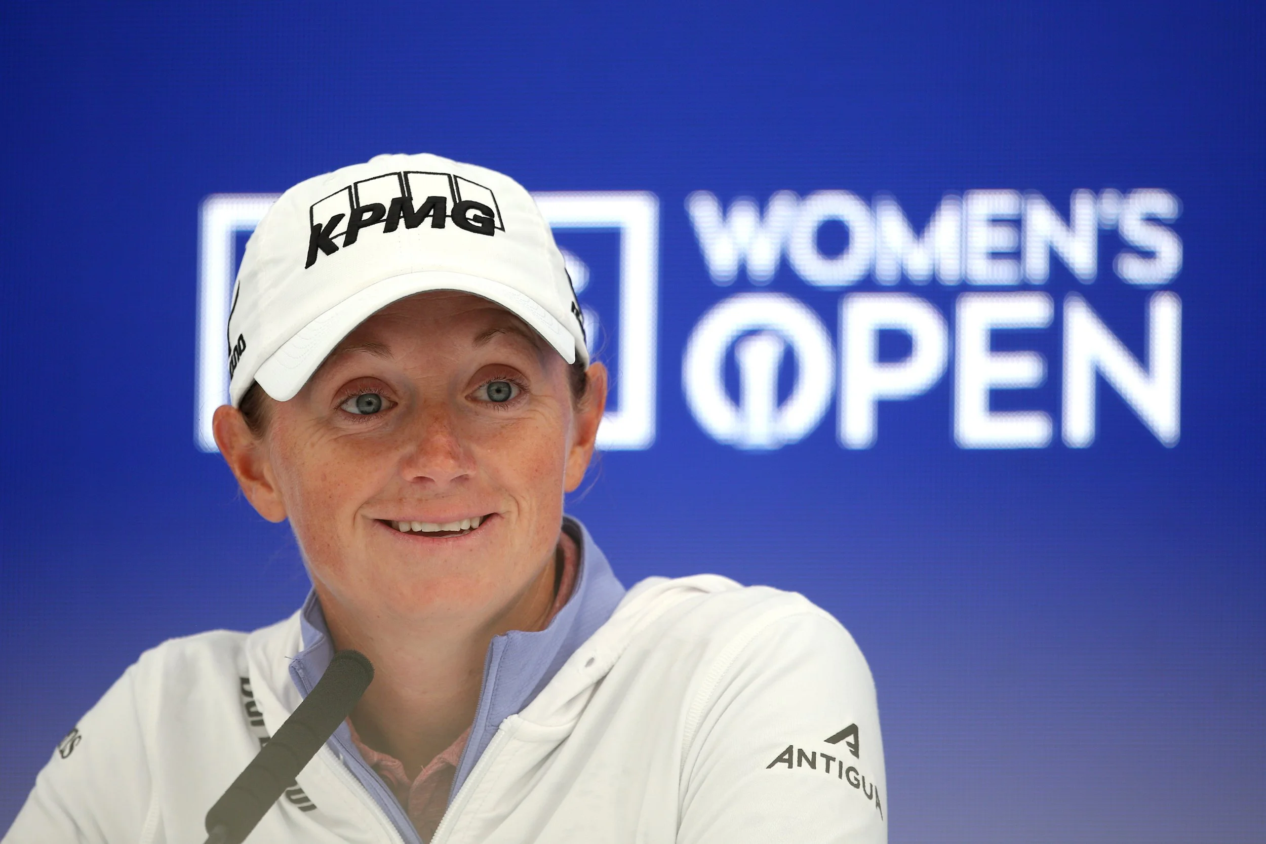 Stacy Lewis of the United States speaks in a press conference ahead of the AIG Women's Open at St Andrews Old Course on August 21, 2024 in St Andrews, Scotland. (Photo by Kate McShane/R&A/R&A via Getty Images)