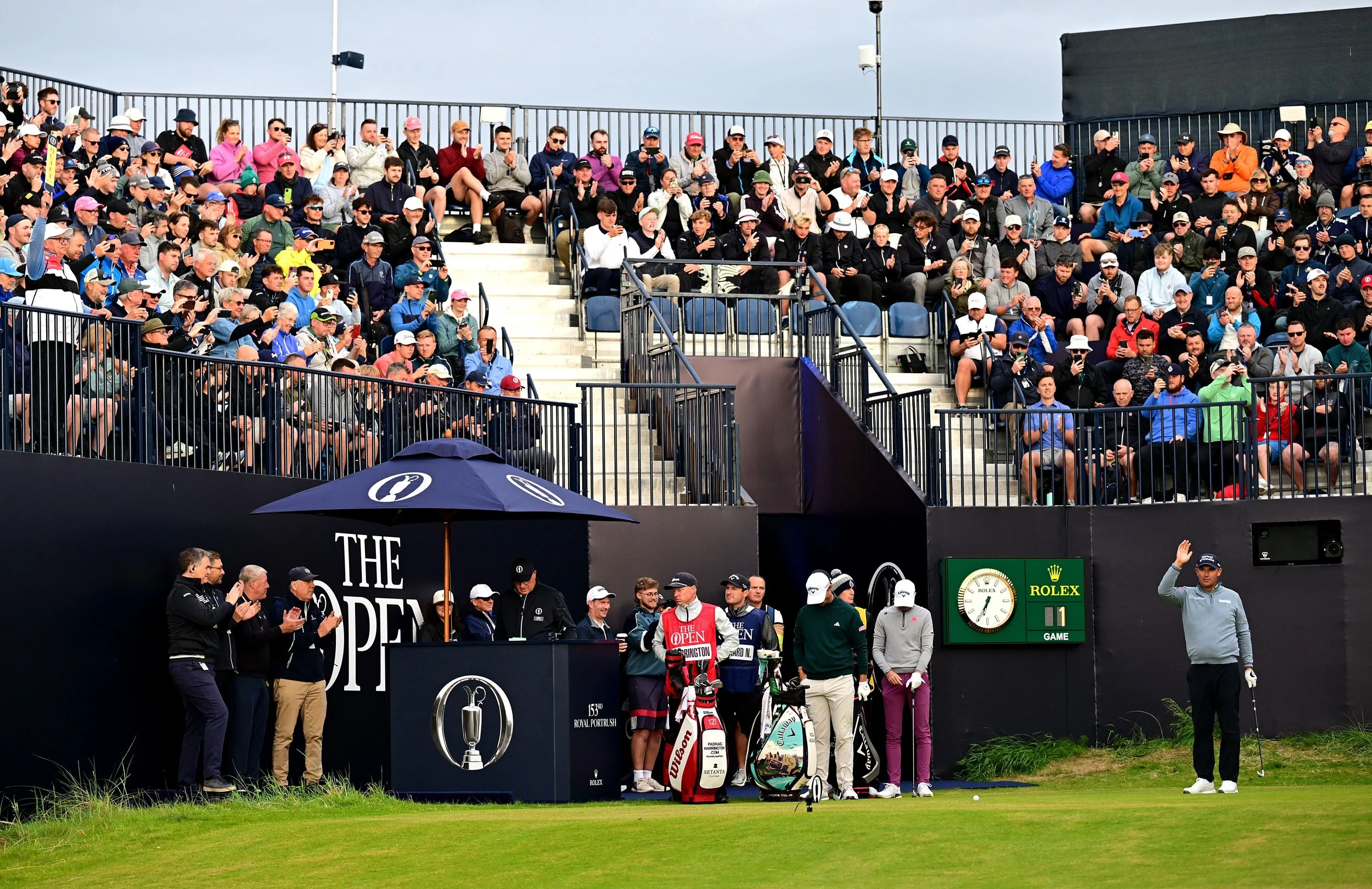 Padraig Harrington of Ireland acknowledges the crowd on the first tee ahead of Day One of The 153rd Open Championship at Royal Portrush Golf Club on July 17, 2025 in Portrush, Northern Ireland. (Photo by Oisin Keniry/R&A via Getty Images)
