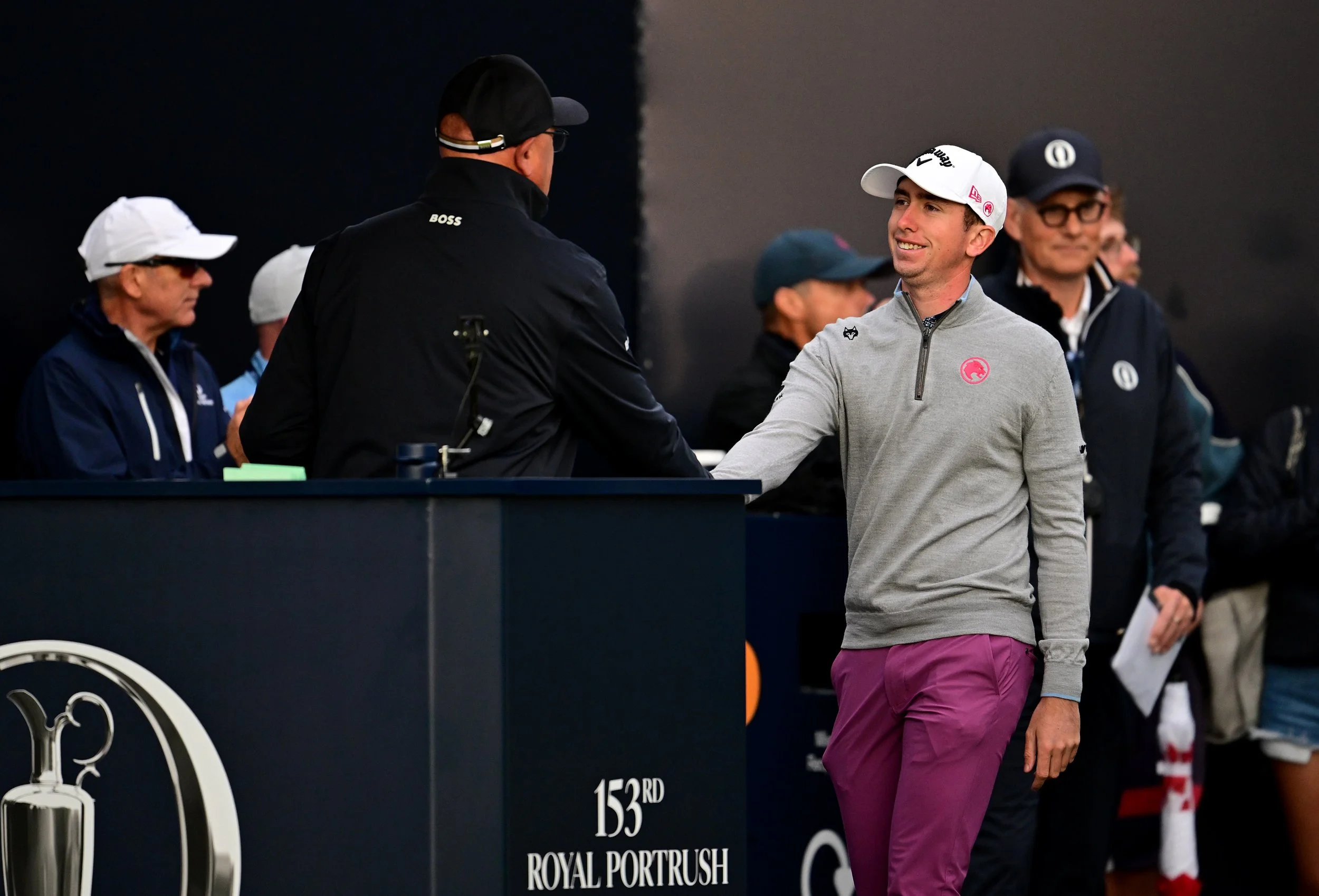 Tom Mckibbin of Northern Ireland shakes hands with Official Starter, David Lancaster, on the first tee during Day One of The 153rd Open Championship at Royal Portrush Golf Club on July 17, 2025 in Portrush, Northern Ireland. (Photo by Oisin Keniry/R&A via Getty Images)
